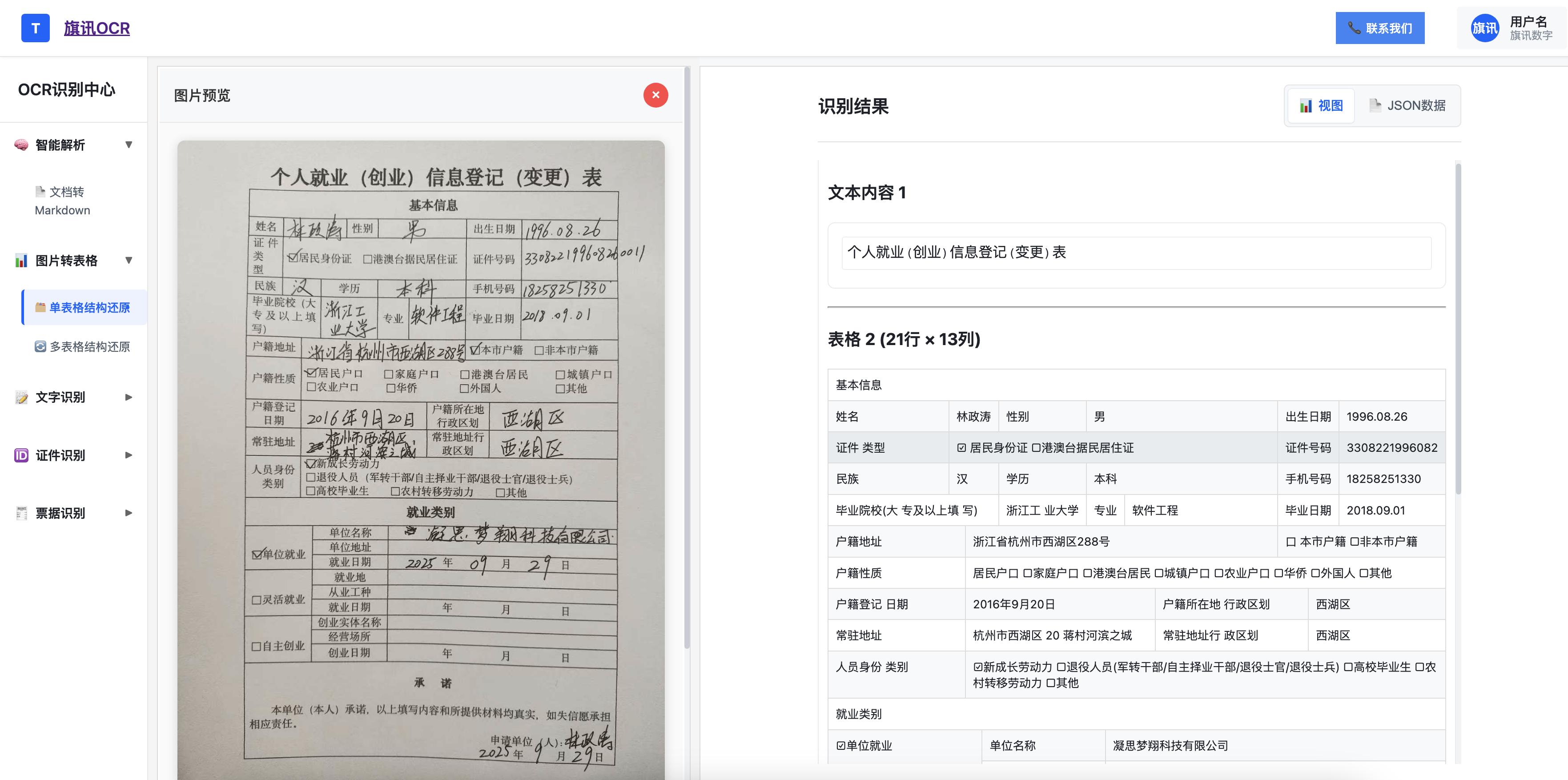 传统 OCR 仅能 “看见” 数据,而旗讯 OCR 通过 “精准识别 + 行业化结构化”,真正让数据 “能用、好用”。它不仅帮各行业减少人工成本、降低错误率,更让沉淀在表格中的 “静态数据” 转化为 “可分析、可流转” 的 “动态数据”,为医疗合规、基金决策、教育管理等提供数据支撑,成为全行业数字化转型的核心工具。