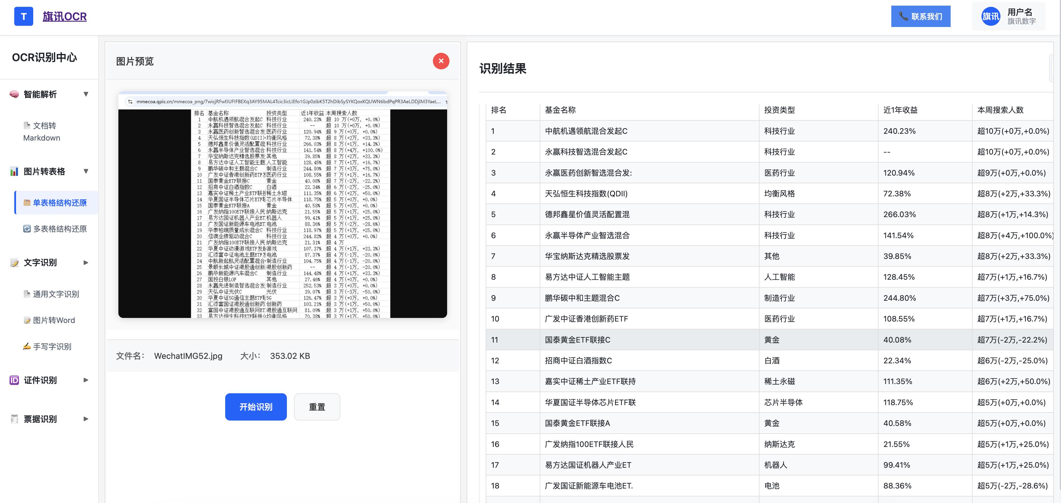 应用:批量识别基金持仓表格、行业研报数据,结构化后对接投研系统,自动计算持仓占比、收益率。