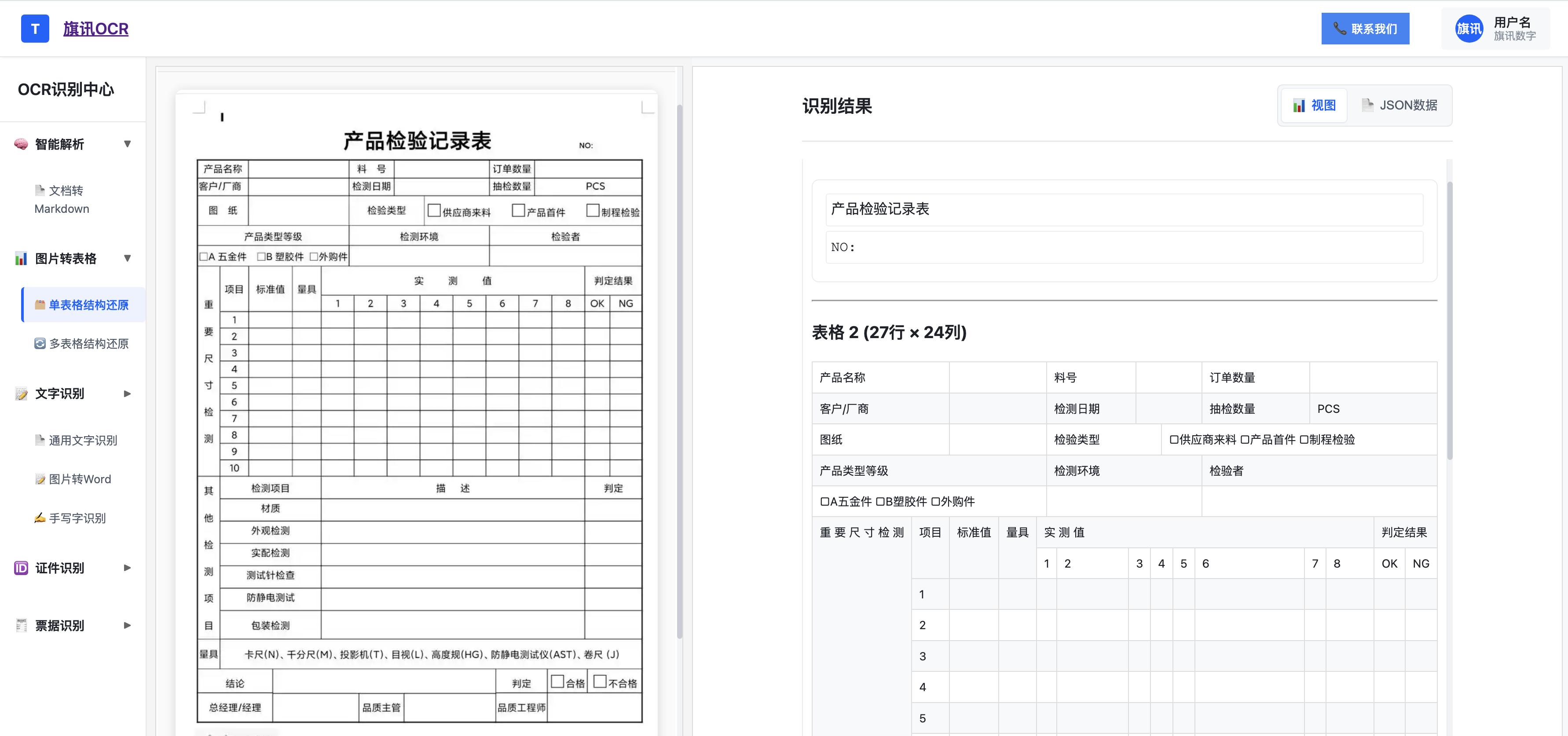 如果说表格识别是 “读字”,智能结构化就是 “理数据”—— 旗讯 OCR 能按各行业业务逻辑,将数据转化为标准化格式,直接对接后续系统,无需人工转译。