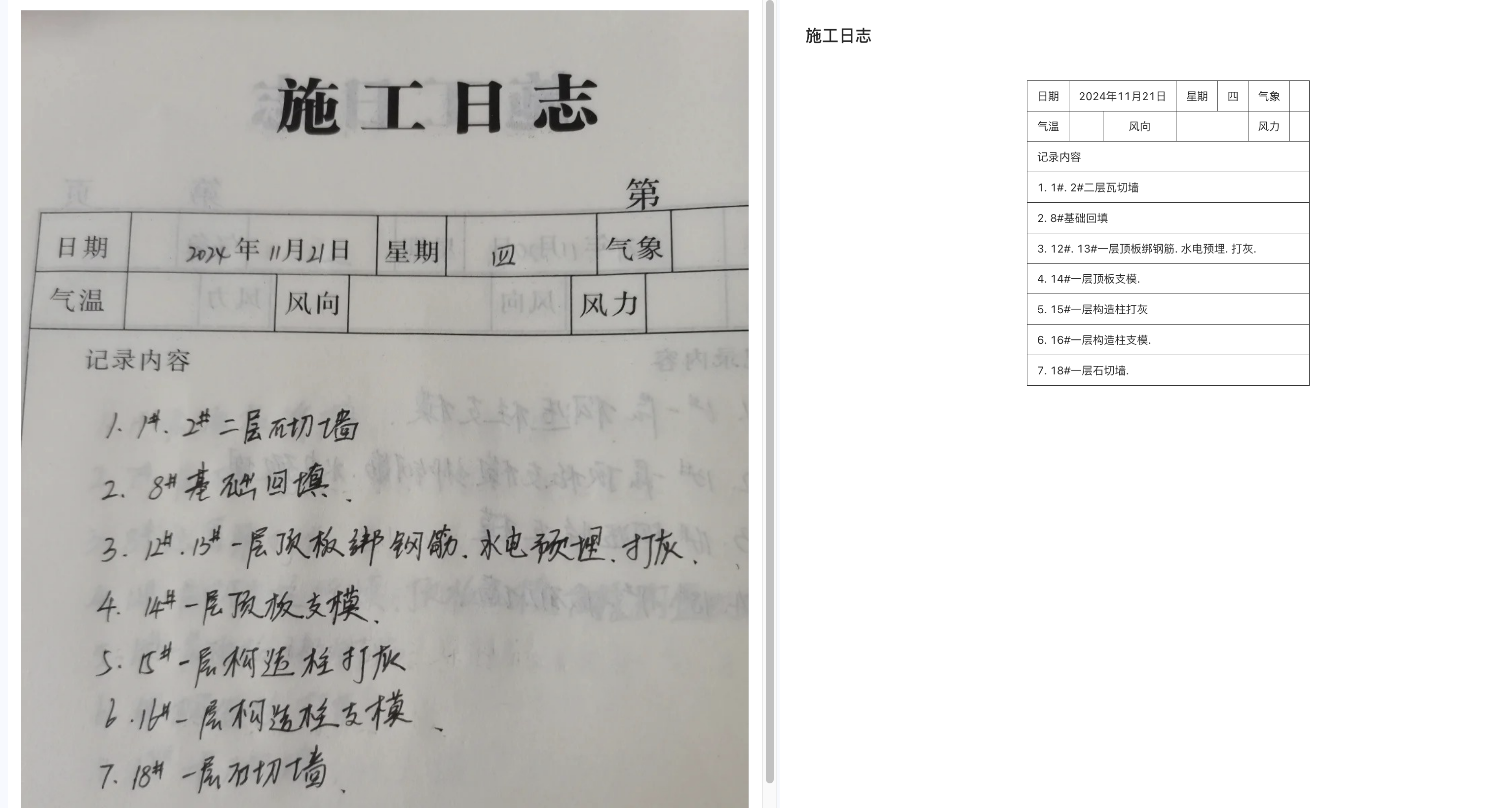 全类型表格精准识别:支持 施工日志(每日进度 / 人员 / 材料记录)、监理日志(质量问题 / 整改意见)、施工计划表(工序安排 / 资源分配)、施工监测表(混凝土强度 / 钢筋间距)、施工记录表(隐蔽工程 / 验收记录) 等全品类建筑手写表格,无需单独配置模板;