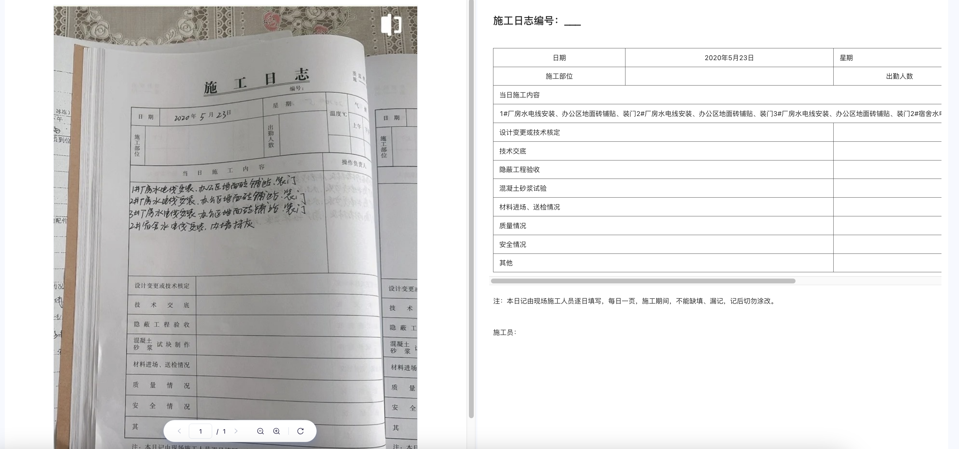 效率极低:依赖人工逐行录入手写内容,一份施工日志平均录入耗时超 30 分钟,大型项目日均百份表格需投入 3-5 人天,严重占用人力成本;