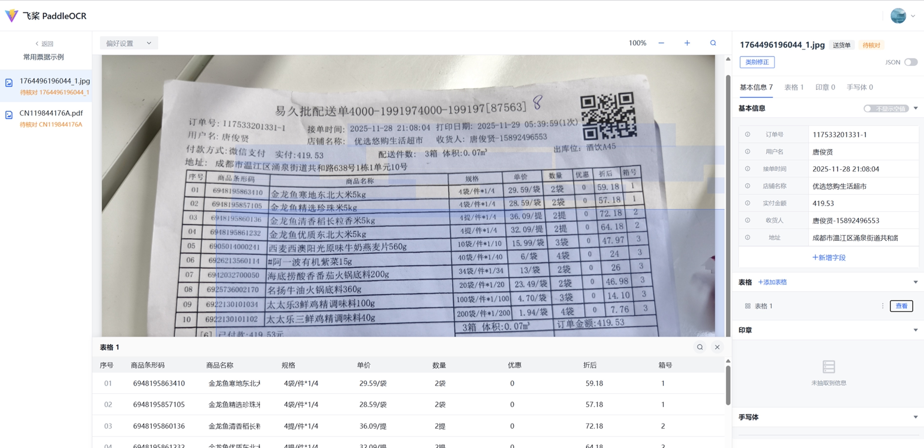 物流仓储场景:物流企业、仓储中心的手写入库单、出库单、配送单、签收单等,涉及货品名称、规格、数量、单价、收货地址、联系人、签收状态等关键信息,人工录入滞后导致库存数据更新不及时、物流轨迹追踪困难。旗讯 OCR 可快速识别这些关键信息,生成库存汇总表、物流配送统计表格、签收确认报表,实时同步至仓储管理系统(WMS)、物流管理系统(TMS),助力企业实现货物流转数据的实时监控与高效管理,减少因数据错误导致的物流延误与库存积压。