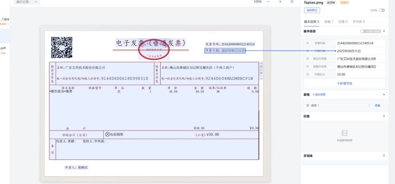 财务报销场景:企业员工提交的手写报销单、差旅费单据、办公费票据等,格式不一、字迹各异,财务人员录入核对工作量巨大。旗讯 OCR 可精准抽取员工姓名、部门、报销类型(交通费、差旅费、办公费等)、金额、发票号、报销事由等信息,自动校验金额与发票号的匹配性、日期的合法性,生成按部门、费用类型、时间段分类的费用汇总表,财务人员仅需复核系统提示的异常单据,处理时间从数天缩短至数小时,错误率降至 0.1% 以下,大幅减轻财务工作压力;
