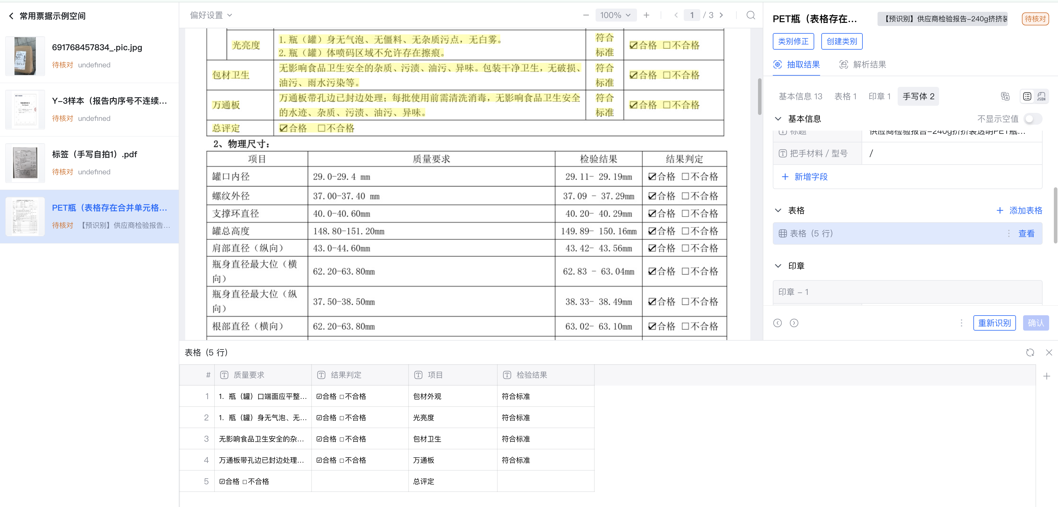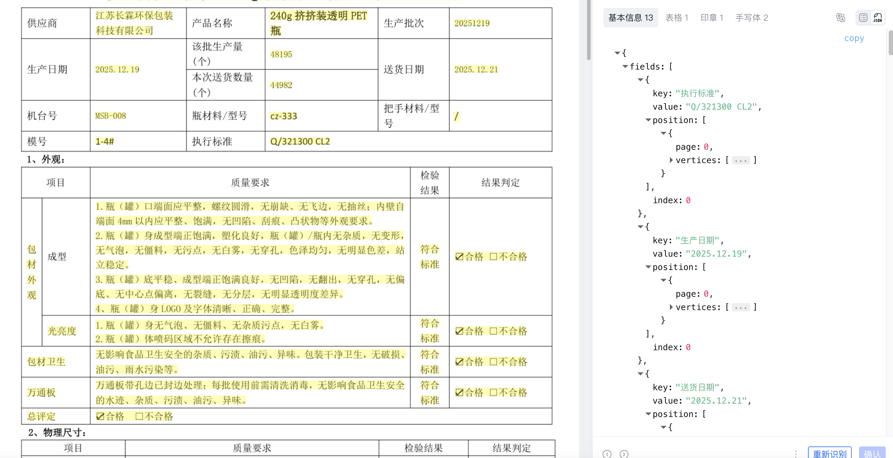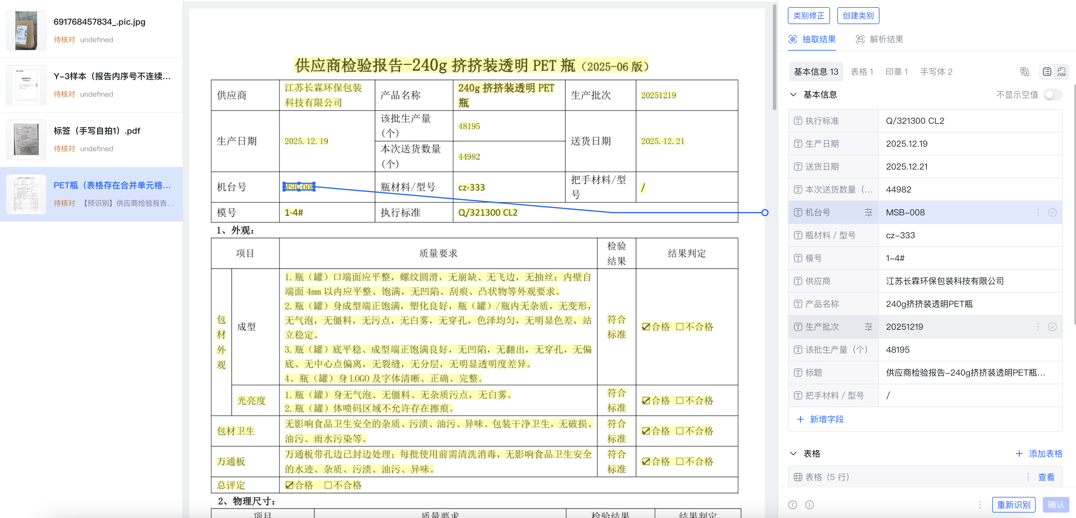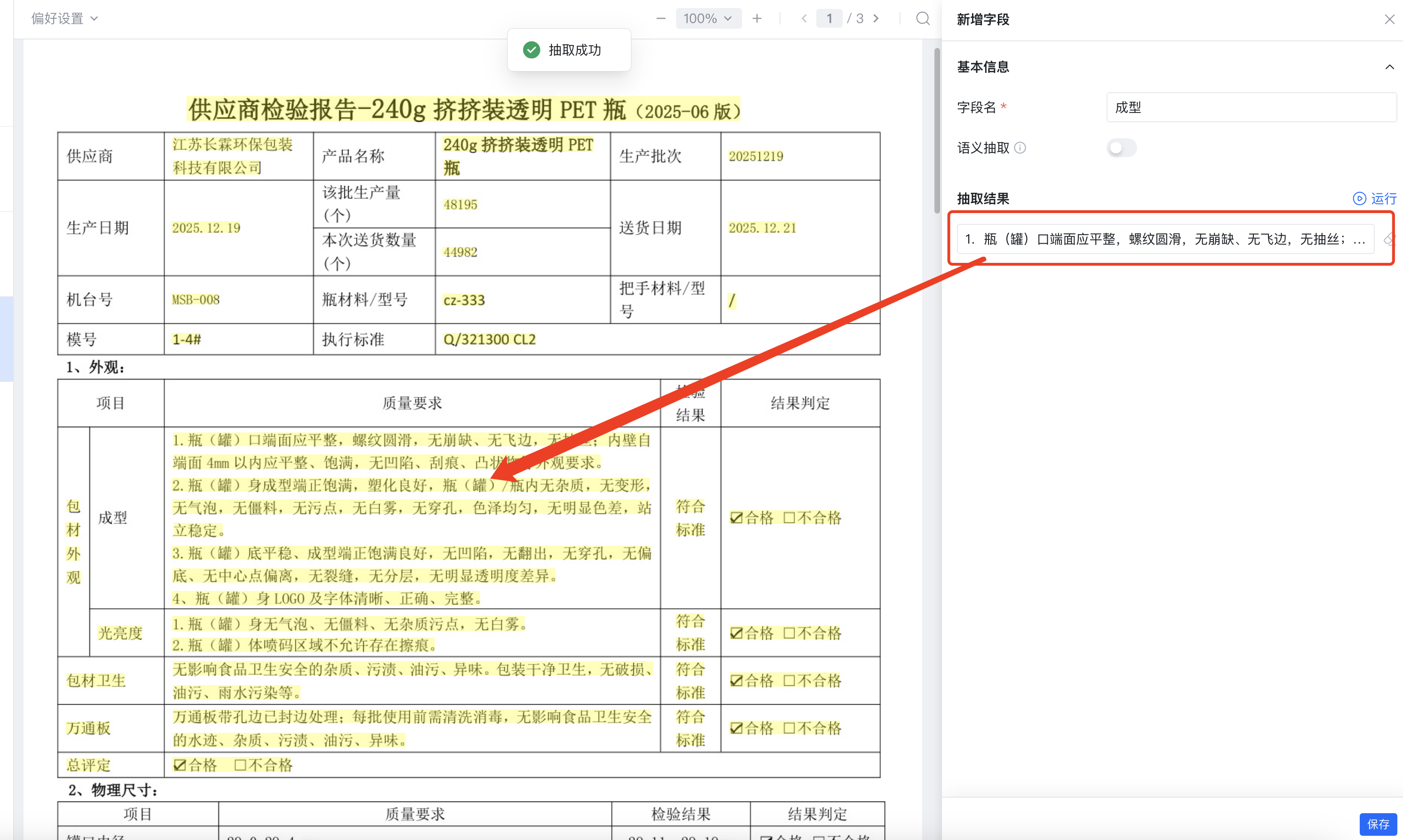 在字段配置层面,系统兼顾通用性与个性化:预设各类文档核心基础字段,如检验报告的外观、物理尺寸、壁厚等,满足行业通用需求;同时支持字段批量增删改,可灵活配置识别抽取、语义抽取等提取方式,适配不同企业的个性化业务场景。通过异常提示配置,用户可设置字段缺失、格式错误等异常场景的提醒规则,实现异常数据自动预警,提升复核处理效率。