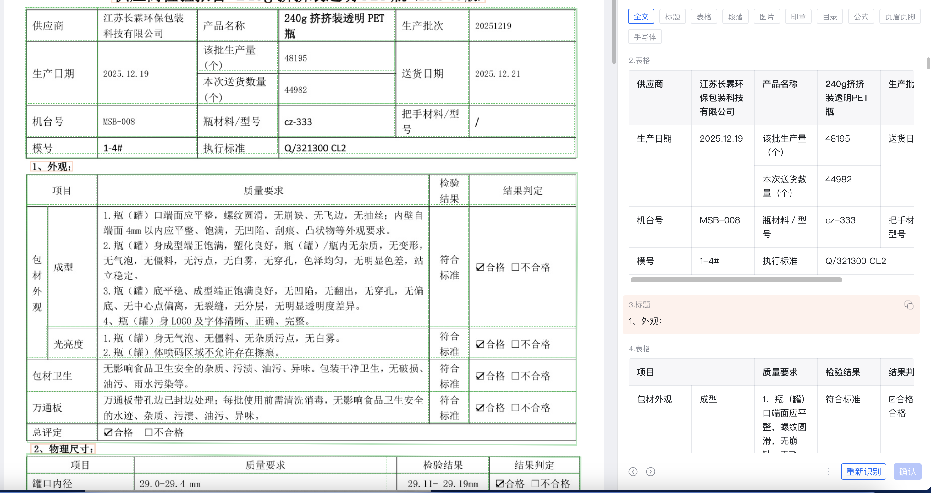在识别管理层面,系统提供清晰的识别完成列表,以文件缩略图、识别状态、文件编号等关键信息多维展示成果,支持快速检索定位目标文件,大幅降低文档管理成本。识别结果呈现采用1:1还原模式,完美复刻原报告版式布局,确保内容直观可辨,无需反复对照原文件。