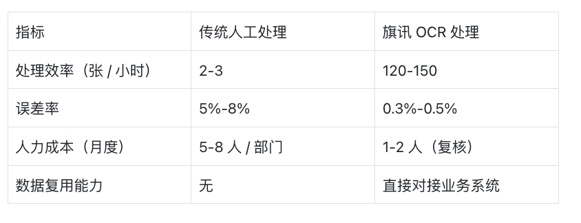 某国有银行应用案例显示,其总行及 30 家分行推广旗讯 OCR 后,月度报销处理量从 5000 张提升至 20000 张,且未增加财务人员编制。